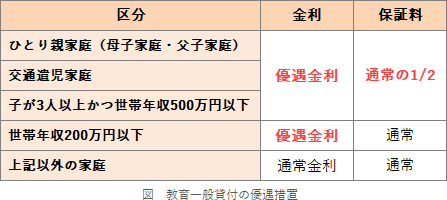 - 日本政策金融公庫の教育一般貸付(国の教育ローン)の融資金利は、ひとり親家庭や交通遺児家庭等を対象として優遇措置が講じられている。