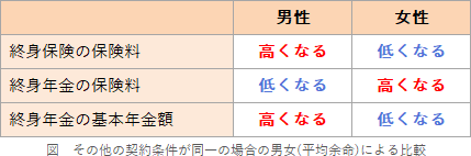 - 個人年金保険(終身年金)の保険料は、被保険者が同年齢で、基本年金額や保険料払込期間、年金受取開始年齢などの契約内容が同一の場合、被保険者が女性である方が男性であるよりも高くなる。