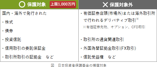 - 証券会社が取り扱っている外国為替証拠金(FX)取引は、日本投資者保護基金の補償の対象とならない。