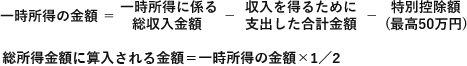 - [不適切]。最高50万円の特別控除額が抜けています。一時所得は以下の算式で計算します。2分の1する前の金額が一時所得の金額となります。