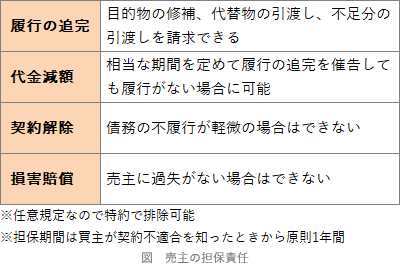 - [不適切]。売買の目的物に契約不適合があった場合、売主はその契約不適合について故意・過失の有無にかかわらず、履行の追完、代金減額、契約解除、損害賠償などの担保責任を負います。