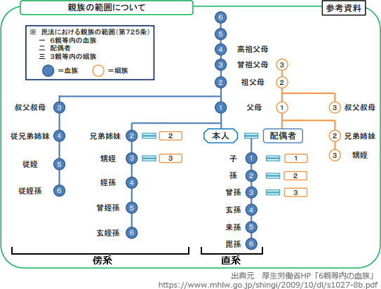 - 親族とは、6親等内の血族、配偶者および3親等内の姻族をいう。